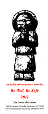“As I look toward expanding my work, becoming abbot of Dai Bosatsu Zendo in addition to my responsibilities here, I am buoyed by the serious yet exuberant practice of my students.” “In order to meet the considerable financial obligations that make our work possible, we humbly request your year-end support, so that we may continue to offer authentic Zen training, enhance our surrounding community's well-being, care for our beautiful facilities, and provide a place of serenity and true happiness for all.” “The enclosed 2011 ‘Be Well, Be Safe’ card has been on the Zen Center's altar. You may place it near the front door in your home, as a blessing for you and your family in the coming year, and to welcome visitors.” |
