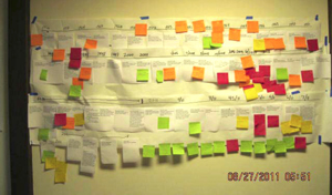 “This is to summarize the structure of a facilitated discussion meeting for the Zen Studies Society, held at Dai Bosatsu Zendo Kongo-Ji on August 27 and 28, 2011. It was facilitated by An Olive Branch, a group centered out of the Zen Center of Pittsburgh that is committed to, among other things, assisting organizations like ZSS arrive at facilitated resolution in difficult circumstances.” “Informational Paper presented by An Olive Branch The purpose of this part of the meeting was to contextualize the ZSS situation, providing an overview of sexual misconduct within spiritual communities, the impact it has on members, the particular aspects of monastic training that may influence the frequency of sexual misconduct, and ways individuals can work effectively within a fractured community.” “Samoan Circle This portion of the meeting was designed to allow all Sangha members (present and not present) to make a heartfelt statement of their feelings and concerns related to the events of the last year-and-a-half within ZSS (and earlier) and to have their concerns acknowledged by the Board (and, as the meeting progressed, also by the rest of the participants)." “Participants were seated in a circle and asked to write each of their individual concerns on a 4x6 card. After completing their cards, participants were invited to move to one of three empty chairs in a small inner circle comprised of Shinge Roshi, Soun Joe Dowling (later, Larry Shainberg), and two of the facilitators. Everyone else sat in an outer circle observing those in the inner circle. After the participant presented his or her concern(s), either Shinge Roshi, Soun or one of the facilitators made a restatement to acknowledge the key points they raised and asked them if they felt heard. If so, the Sangha member was asked to place their 4x6 card in a bucket in the center of the room as a sign that they had been heard. This procedure was later revised to include a step in which the entire Sangha present voiced the phrase ‘We hear you’ to acknowledge the speaker.” “The last step in the Samoan Circle was a small ceremony led by Shinge Roshi after dinner. During the ceremony the cards containing Sangha members’ concerns that had been deposited in the bucket were set on fire to symbolize that they had been heard by all.” “Consensus Workshop The activities and discussion above focused on the revelations of ethical breaches and the Sangha members’ emotions related to those breaches. The remainder of the meeting was about how ZSS could move forward. A focus question was posed: 'What issues need to be addressed in order to grow a new lotus flower from this muddy water?' Participants first worked alone to brainstorm answers to the question; then in pairs, coming up with 5 ideas per pair to share with the group.” “Conclusion The Zen Studies Society has held a respected place within the larger Buddhist community for many years. This respect has been severely tested. Many strong Sangha members have felt they had to leave ZSS when their concerns were not addressed by previous boards, and during the meeting many stories were heard regarding how painful those departures have been both for those who stayed and for those who left.” “This meeting demonstrated that there are Sangha members who are deeply committed to the future of ZSS, as evidenced by their willingness to return to DBZ despite Hurricane Irene, listen to each other’s stories, and begin to co-create a way forward. This work was emotionally exhausting, but extremely important. It established a precedent for how ZSS must interact going forward. We believe any possible rebuilding of the ZSS will require more of this kind of commitment, respect for each other, deep listening, open communication, and prompt, transparent and sustained action by the Board.” [While the particulars of the timeline are illegible in the photo, the number of (also illegible) Post-its suggests that personal reactions were more heart-felt than the report itself.] |