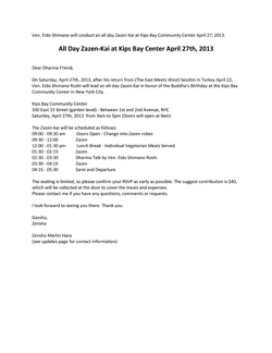 Ven. Eido Shimano will conduct an all day Zazen Kai at Kips Bay Community Center April 27, 2013.All Day Zazen-Kai at Kips Bay Center April 27th, 2013 |