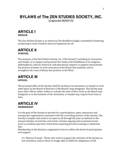 BYLAWS of The Zen Studies Society, Inc.(Captured 09/02/13)From the Zen Studies Society Website at:www.zenstudies.org/bylaws.html |