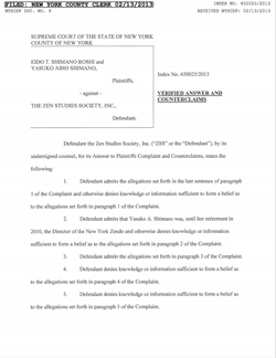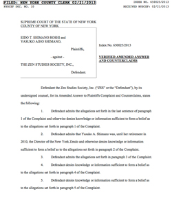 SUPREME COURT OF THE STATE OF NEW YORKCOUNTY OF NEW YORKVERIFIED AMMENDED ANSWER AND COUNTER CLAIMS------------------------------------------------------------------EIDO T. SHIMANO ROSHI andYASUKO AIHO SHIMANO,Plaintiffs,– against –THE ZEN STUDIES SOCIETY, INC.,Defendant.INDEX NO. 650025/2013RECEIVED NYSCEF: 02/21/2013 |