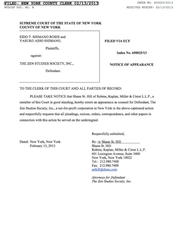 SUPREME COURT OF THE STATE OF NEW YORKCOUNTY OF NEW YORKNOTICE OF APPEARANCE------------------------------------------------------------------EIDO T. SHIMANO ROSHI andYASUKO AIHO SHIMANO,Plaintiffs,– against –THE ZEN STUDIES SOCIETY, INC.,Defendant.INDEX NO. 650025/2013RECEIVED NYSCEF: 02/13/2013 |
