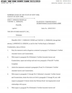 “Plaintiffs, EIDO T. SHIMANO ROSHI and YASUKO A. SHIMANO, through their Attorney, LAWRENCE D. GERZOG, as and or their Verified Reply to Defendant's Counterclaims state a follows:” "4. With respect to paragraphs 31 through 38 of Defendants Amended Verified Answer and counterclaims, denies the claims set forth in paragraph 32 through 38, and with respect to paragraph 31 thereof, denies that Shimano Roshi had inappropriate sexual relationships with anyone." “Counterclaims. FIRST AFFIRMATIVE DEFENSE TO COUNTERCLAIMS 10. The counterclaims asserted in the Verifird Amended Answer and Counterckaims are barred, in whole or in part, by he doctrines of waiver, equitable estoppel, ratification and unclean hands, SECOND AFFIRMATIVE DEFENSE TO COUNTERCLAIMS 11. One or more of the counterclaim arc barred by he applicable statute(s0 of limitations. WHEREFORE, plaintiffs demand judgment against defendant: l . On the first through fourth causes of action in an amount to be determined at trial. 2. On the fifth cause of action actual damages in the amount of $1,000,000.00;. 3. On the fifth cause of action punitive damages in the amount of $1,000,000.00; 4. Dismissal of Defendant’s Counterclaims;” |