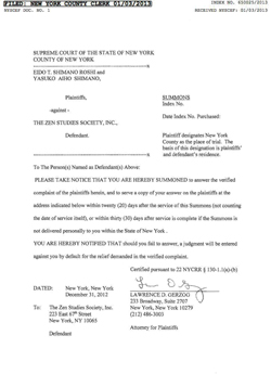 SUPREME COURT OF THE STATE OF NEW YORKCOUNTY OF NEW YORK------------------------------------------------------------------EIDO T. SHIMANO ROSHI andYASUKO AIHO SHIMANO,Plaintiffs,– against –THE ZEN STUDIES SOCIETY, INC.,Defendant.INDEX NO. 650025/2013RECEIVED NYSCEF: 01/03/2013 |
