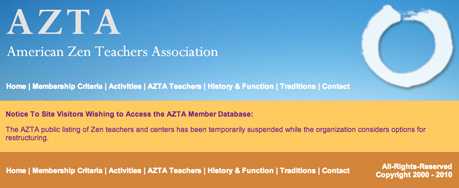 "Notice To Site Visitors Wishing to Access the AZTA Member Database:" "The AZTA public listing of Zen teachers and centers has been temporarily suspended while the organization considers options for restructuring." [Reference Screengrab