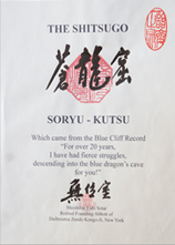 "On the first day, Zenrin Robert Lewis was given Dharma Transmission, through a special ceremony conducted by Eido Roshi. Zenrin was bestowed the title of Roshi and was given the name Sōryu-Kutsū which translates as ‘Blue Dragon Cave’. The name was taken from the Blue Cliff Records ‘For over 20 years, I have had fierce struggles, descending into the blue dragon's cave for you!’ " |
