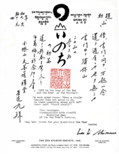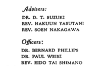 | Folleto de la Sociedad de Estudios Zen, alrededor de 1970 | “La Sociedad cuenta con dos patrocinadores espirituales, Hakuun Yasutani Roshi y Soen Nagakawa Roshi, quienes son Maestros Zen japoneses. Yasutani Roshi es conocido en este país por sus conferencias recopiladas y editadas por Philip Kapleau en Los Tres Pilares del Zen. Soen Roshi, maestro de Tai San, es abad del Monasterio de Ryutakuji, en Japón. Llegó a los Estados Unidos hace unos veinte años, a invitación de Nyogen Senzaki; desde entonces, ha regresado en varias ocasiones para diseminar las semillas del Budismo en Occidente.“ | |||||||||||||||||||||||||||||||||||||||||||||||||||||||||||||||||||||||||||||||