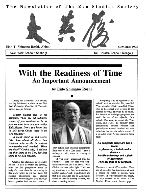 I greatly respect the technical training provided by Eido Shimano, Roshi, who I have been associated with for almost a quarter century. I am grateful for being able to have trained at his isolated country monastery, International Dai Bosatsu Zendo Kongo-Ji, in the town of Hardenburg, Ulster County, New York State. While many express a feeling of debt toward Eido Roshi, I can only express gratitude for what he has taught that has been of value to me and others.
