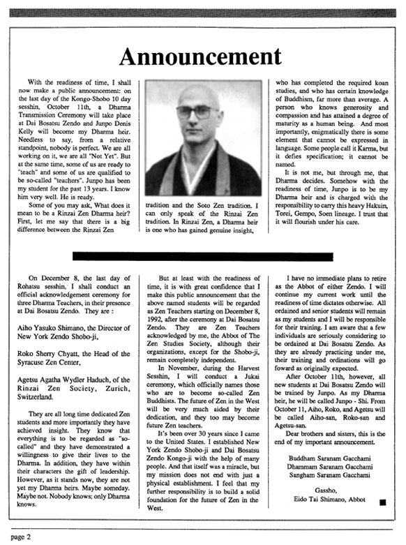 I watched individual after individual fall out of favor and get “written out of history.” The most egregious such revision of the history of Dai Bosatsu Zendo was the recent public announcement, including a press release published in Buddhadharma a leading Buddhist magazine concerning Eido Shimano’s bestowal of “Dharma Transmission” on Denko John Mortensen. This event was announced as the ascension of his Third Dharma Heir. In reality, Junpo Kando Denis Kelly, who was his first publicly announced Dharma Heir was revised out of history, this due to a falling out over Eido Roshi’s lying to him about a sex scandal. So instead of having four officially sanctioned Dharma Heirs there are now three.....