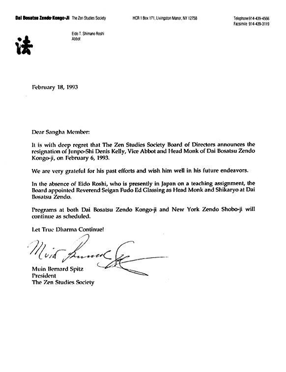 Whatever happened in the board meetings concerning this particular sex scandal was soon compounded by one of the board members announcing her own sexual affair with Eido Roshi. She was soon removed and written out of history. I never really knew of the outcome of the board’s deliberations over these issues. We did receive a letter toward the end of February 1993 announcing the resignation of Junpo-shi Denis Kelly, as Vice Abbot and Head Monk of Dai Bosatsu Zendo. No reason or explanation was given. Here is a copy of the letter: