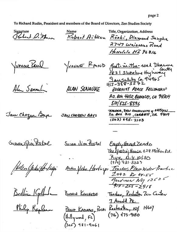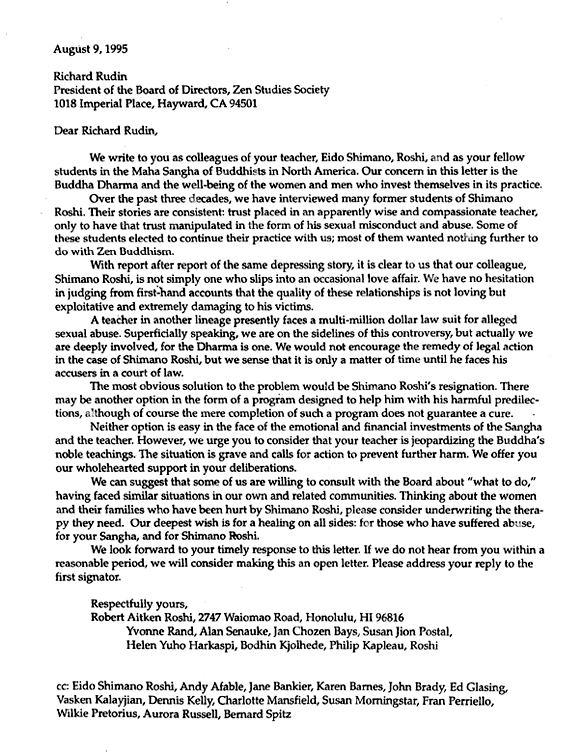 Some six month later I was anonymously sent a copy of another letter signed by eight distinguished American Zen teachers calling for Eido Roshi’s resignation. Here is a copy of the letter: